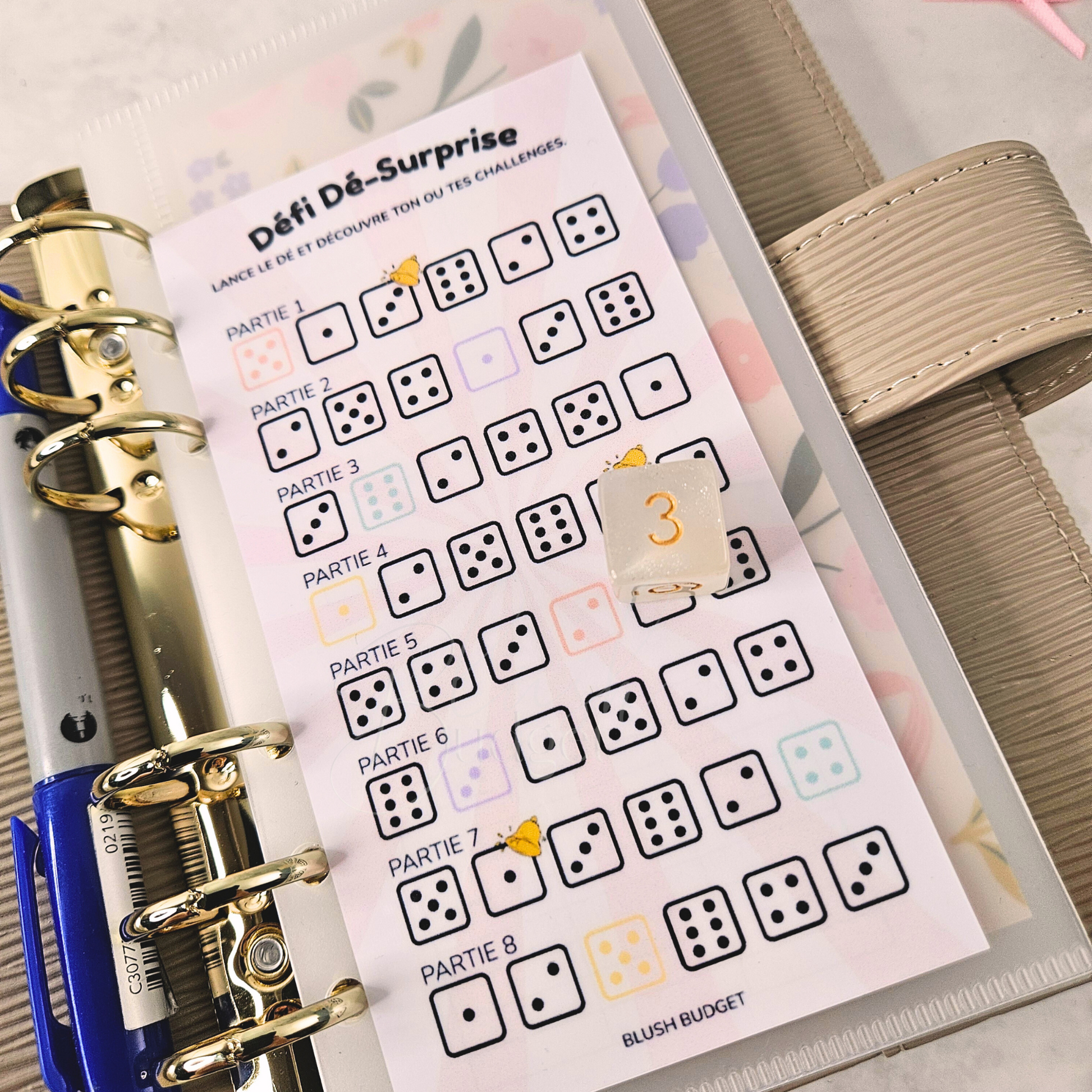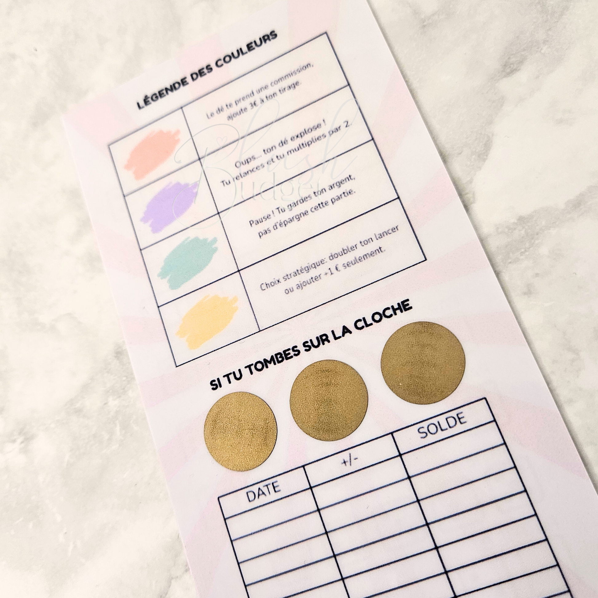 Composé de : 1 tracker avec 8 parties de lancés de dés au recto et légende au verso avec 2 pastilles à gratter.
