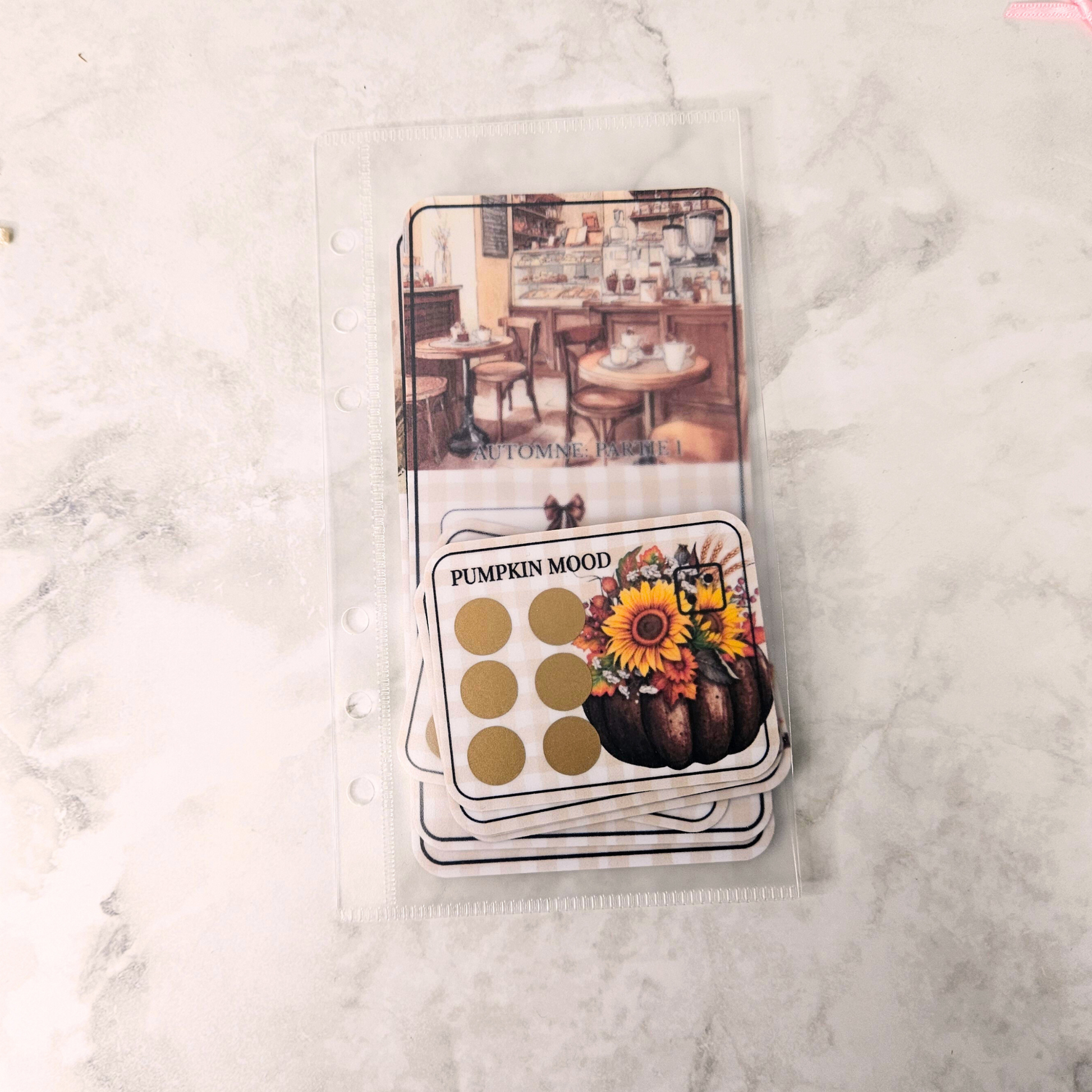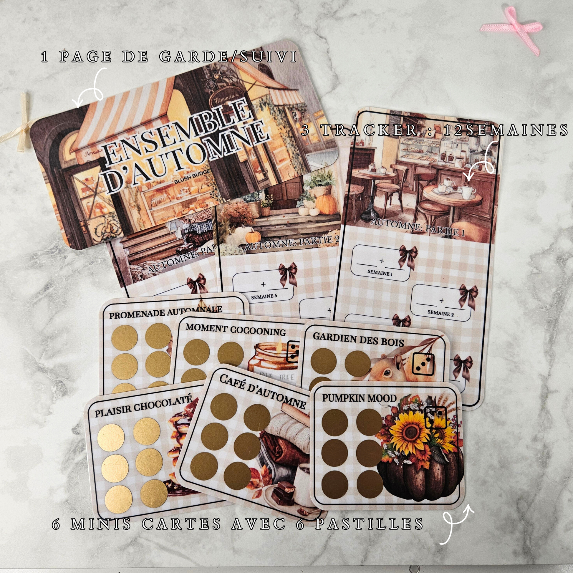 Composé de : 1 page de garde avec suivi au dos + 3 tracker A6 (4 semaines chacun, 12 semaines de défi) + 6 cartes à gratter avec 6 pastilles chacune.