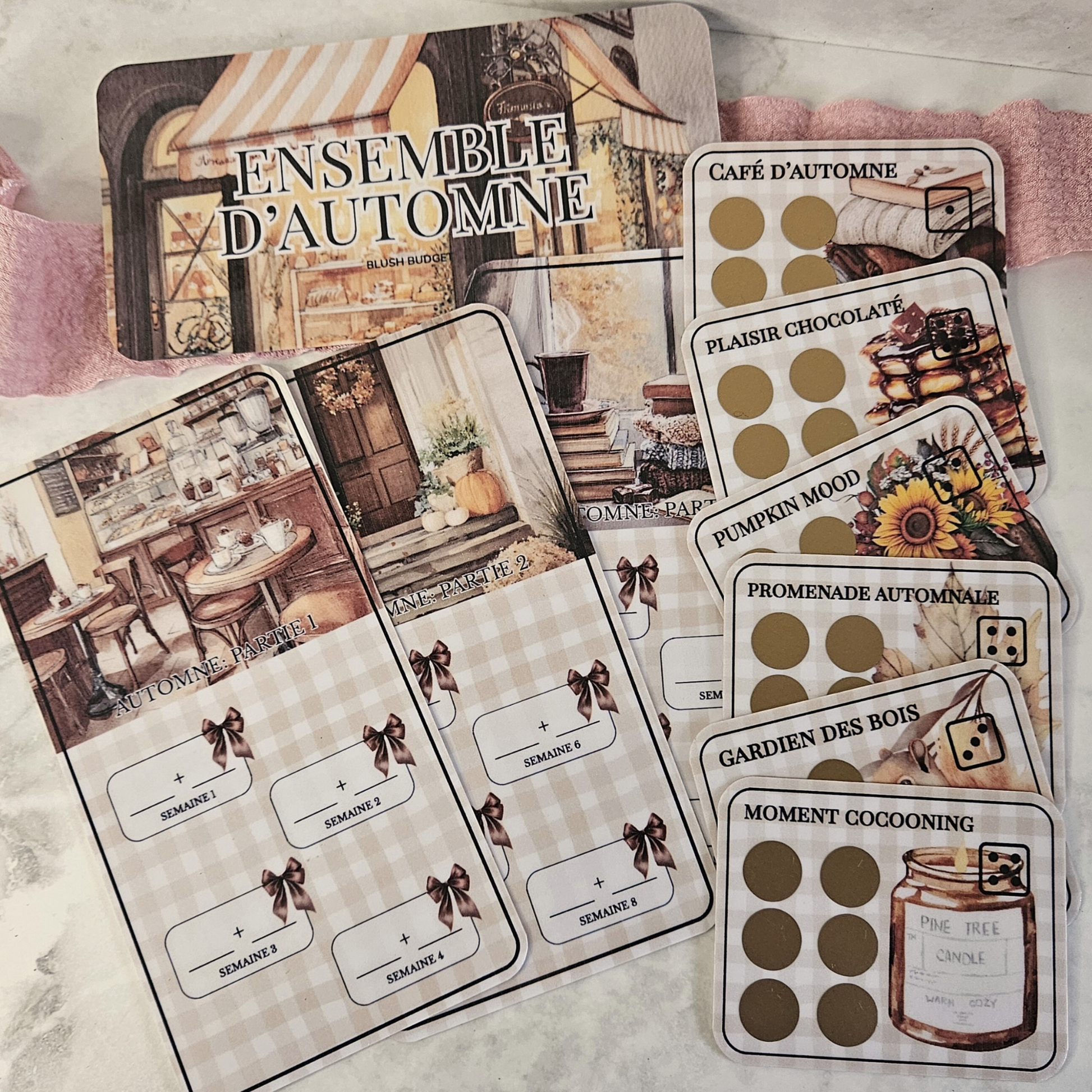 La règle: Chaque semaine d'automne, lance deux dés : le tirage de chaque dé fait référence à une des minis cartes (exemple: je lance, je fais 1 et 4, je prend les minis cartes 1 et 4). Grattez une pastille sur chacune de ces minis cartes et additionner les 2 chiffres que vous avez découvert. (Exemple: sur la carte 1 je gratte 3€ et sur la 4 je gratte 2€, je dois donc épargner 6€ pour cette semaine)