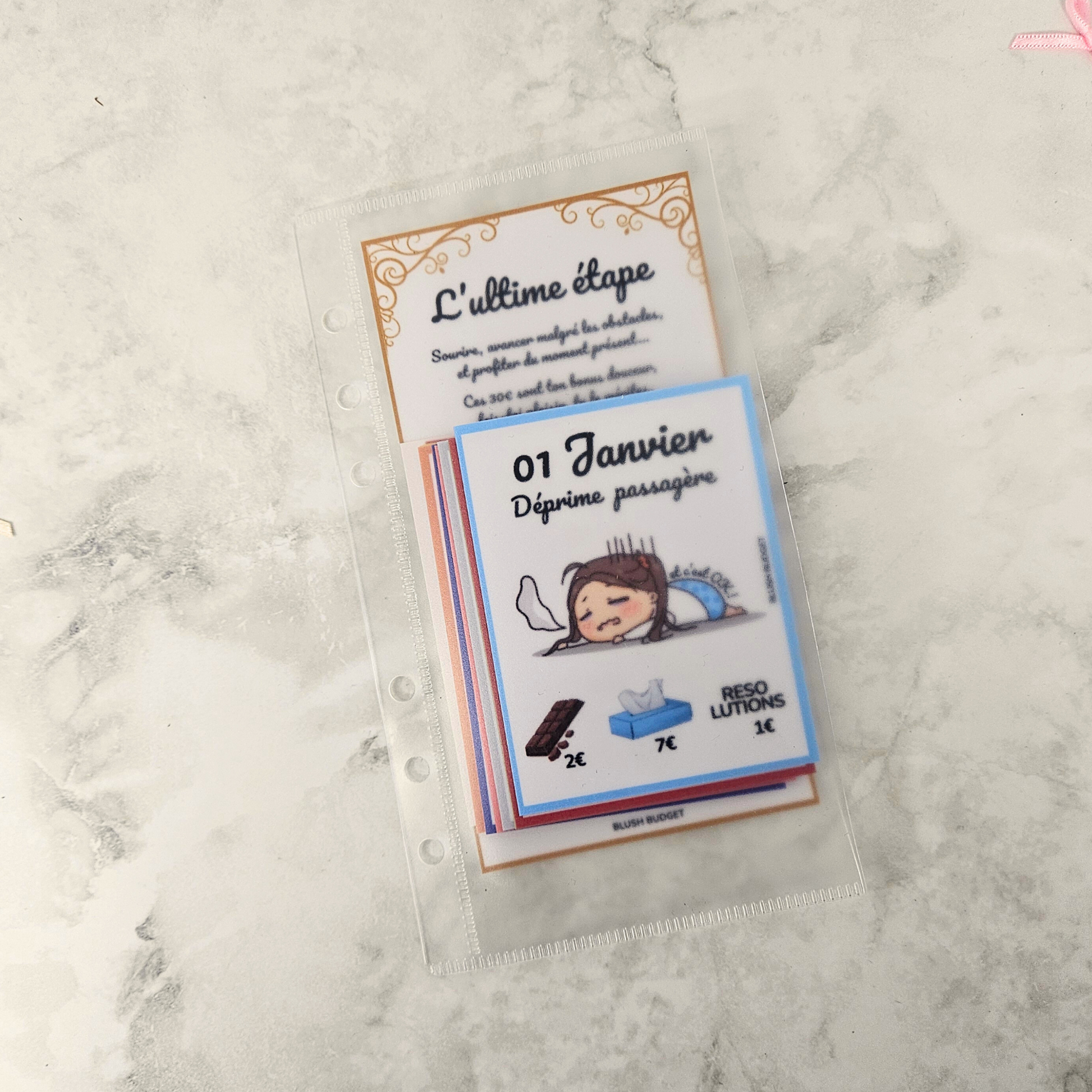 Composé de 12 cartes mensuelles rigolotes + 1 mini tracker + 1 défi A6 “l’ultime étape”.
