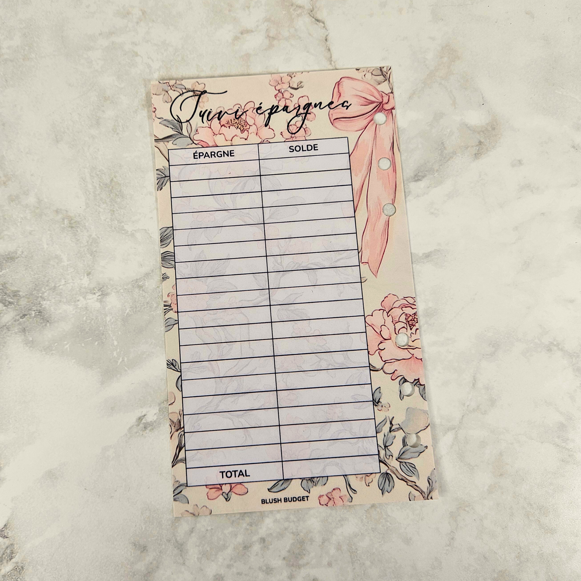 Page de suivi taille A6 perforée dans le même thème que vos trackers épargnes ! À placer au début du classeur pour avoir une vue global sur les totaux des épargnes. Au verso : un tableau de suivi.